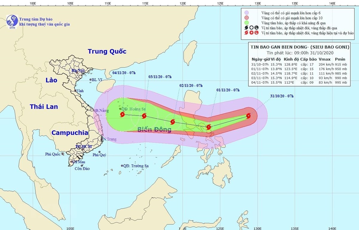 Trung tâm Dự báo Khí tượng Thuỷ văn Quốc gia nhận định, hồi 1 giờ ngày 1/11, vị trí tâm siêu bão Goni ở khoảng 13,7 độ Vĩ Bắc; 125,0 độ Kinh Đông, cách miền trung Philippines (Phi-líp-pin) khoảng 70km về phía Đông. Sức gió mạnh nhất vùng gần tâm siêu bão mạnh cấp 17 (200-220km/giờ), giật trên cấp 17.