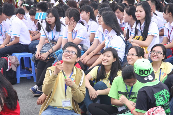Hiện nay hầu hết sinh viên đều sử dụng thành thạo các thiết bị công nghệ thông minh. Trong ảnh: Sinh viên Trường ĐH Kinh tế - luật chụp ảnh bằng smartphone với gậy selfie - Ảnh: Trần Huỳnh