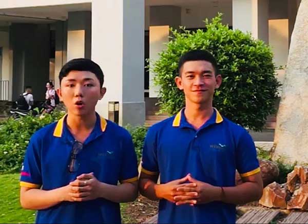 Thành Đạt (trái) và Hoàng Như trong phần thi tự giới thiệu về bản thân và trường học. Ảnh: Nhân vật cung cấp