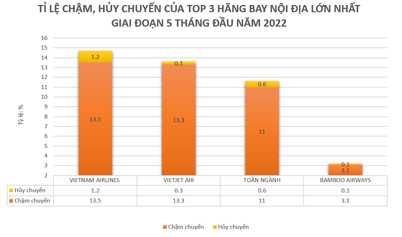 Trong 5 tháng đầu năm 2022, Vietnam Airlines ghi nhận tỉ lệ chậm chuyến là 13,5% (tăng 7,8 điểm so với cùng kỳ) còn Vietjet Air có 13,3% chuyến bay bị chậm (tăng 5,9% so với cùng kỳ). Trong khi đó, tỉ lệ này ở Bamboo Airways là 3,1% (giảm 0,2 điểm so với cùng kỳ).