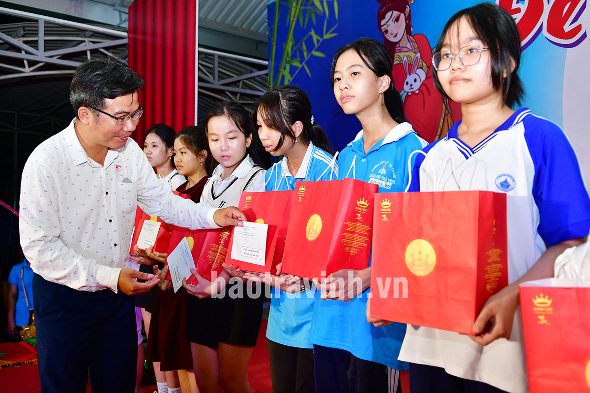 Đồng chí Lâm Hữu Phúc, Phó Giám đốc Sở Văn hóa, Thể thao và Du lịch Trà Vinh trao quà cho các cháu học sinh giỏi.