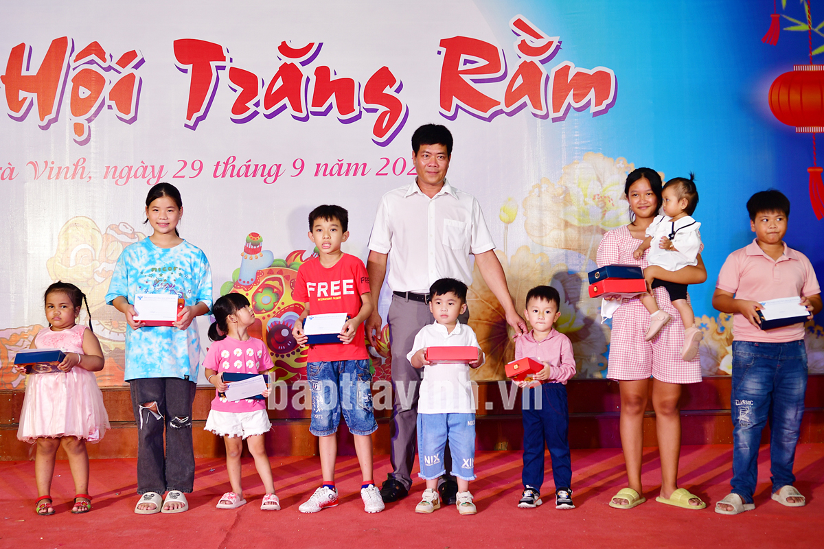 Dịp này, tất cả 180 thanh, thiếu nhi tham dự đêm hội đều nhận được phần quà Trung thu đầy ý nghĩa. Trong đó, có 61 cháu đạt thành tích học sinh giỏi năm học 2022 - 2023 được nhận quà từ Công đoàn cơ sở Sở Văn hóa, Thể thao và Du lịch Trà Vinh.