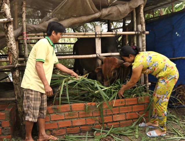 Tiếp lời, chị Huỳnh Bích Thủy, vợ anh Trí bộc bạch: Do hoàn cảnh gia đình hai bên nghèo, nên khi anh chị đến với nhau cách đây 20 năm, chỉ với 2 bàn tay trắng. Trên phần đất nhỏ của gia đình, hai vợ chồng dựng nhà tạm để ở. Do sống bằng nghề làm mướn, thu nhập ít ỏi từ công việc phụ hồ của anh Trí nên khi lần lượt 3 đứa con ra đời, cuộc sống càng thêm phần vất vả. Năm 2015, hai vợ chồng được địa phương xét cho vay vốn sản xuất (số tiền khoảng 20 triệu đồng) để mua một con bò giống về nuôi và chi phí xây dựng chuồng trại. Một thời gian sau, tiếp tục được hỗ trợ 25 triệu đồng để sửa chữa lại căn nhà đã rách nát. Hiện tại, gia đình tôi đã có nơi ở ổn định, lại có bò giống để chăn nuôi. Ba đưa con cũng đã đủ lớn, hai vợ chồng tôi tập trung lao động kiếm tiền, dành dụm vốn để mở rộng sản xuất.