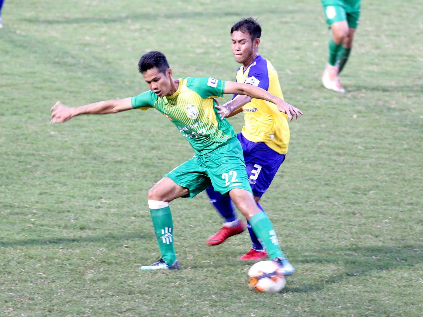 Trung vệ Văn Quân của Cần Thơ (trái) tranh bóng với cầu thủ Đồng Tháp trong trận đấu ở mùa giải 2019.