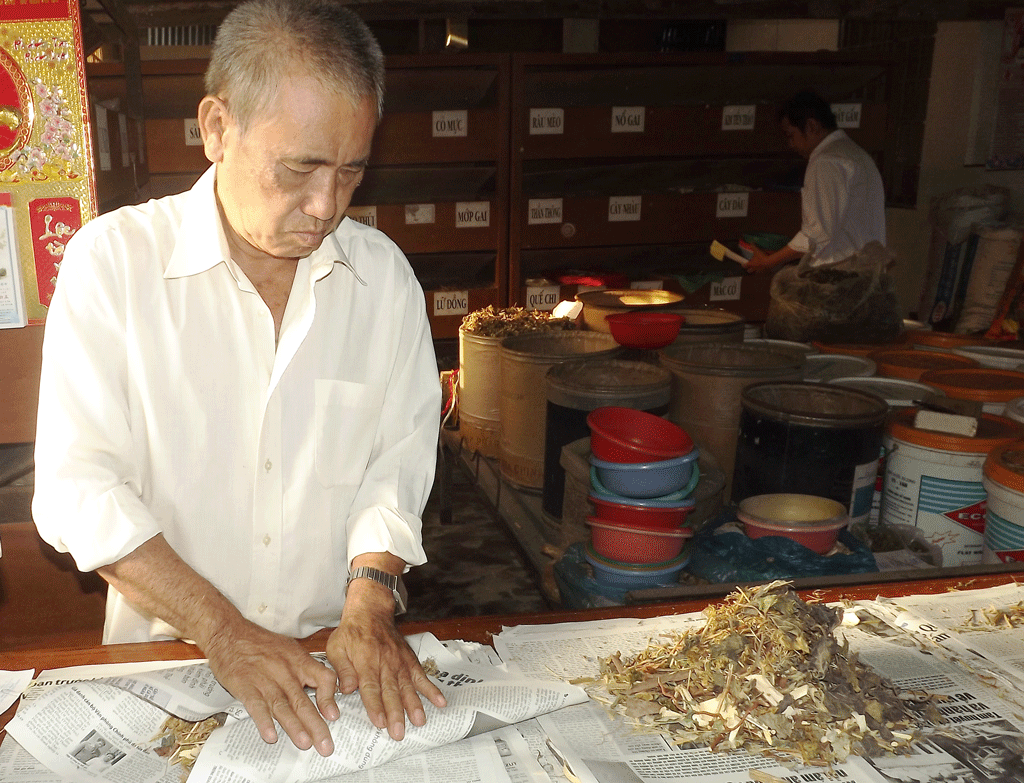 Phòng thuốc nam từ thiện tại đình Bình Yên Đông do ông Kim sáng lập được duy trì nhiều năm nay