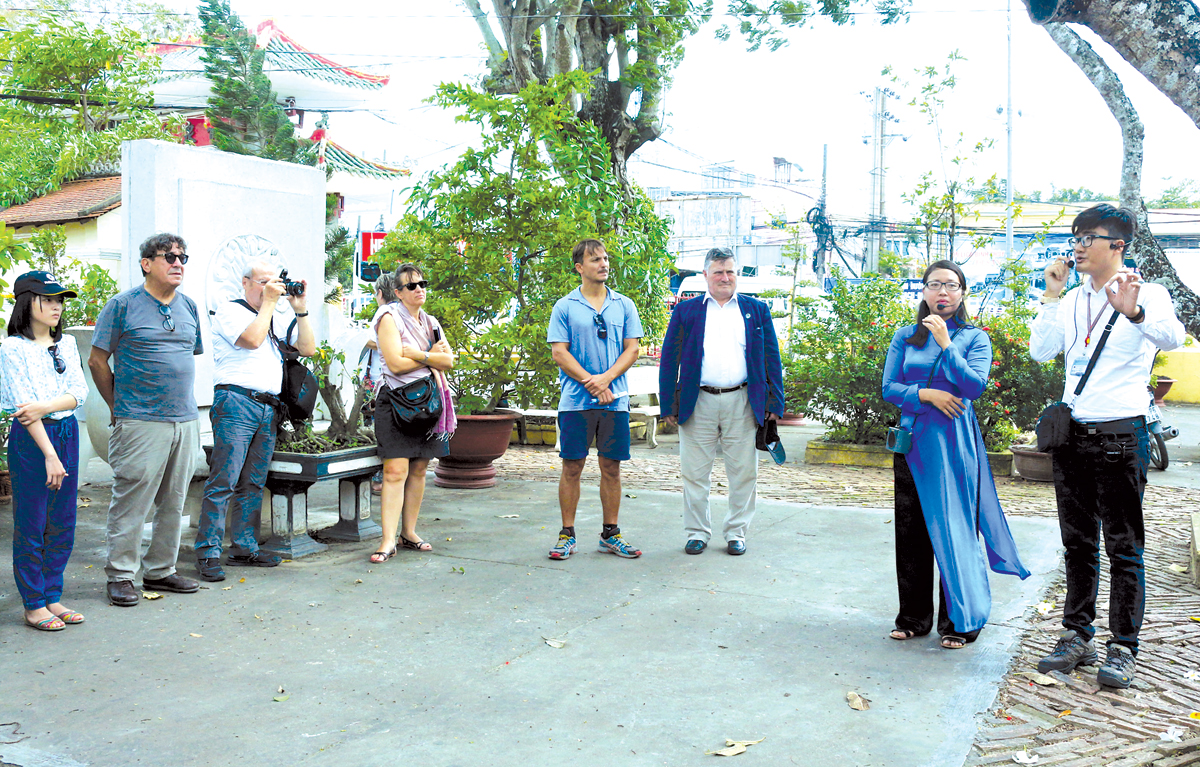 Trần Ngọc Thanh (phải) là tình nguyện viên dẫn đoàn đại biểu Pháp tham quan và
