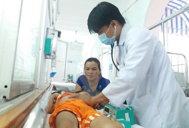 Bác sỹ Bệnh viện Nhi đồng 2 TP. Hồ Chí Minh thăm khám cho bệnh nhi mắc sốt rét. (Ảnh: Phương Vy/TTXVN)