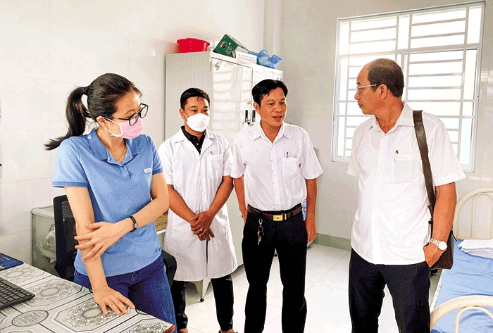 Ông Phạm Phú Trường Giang, Phó Giám đốc Sở Y tế TP Cần Thơ (ngoài cùng bên phải) kiểm tra công tác phòng, chống dịch tại Trạm Y tế phường Thuận Hưng, quận Thốt Nốt. Ảnh: THIÊN THANH