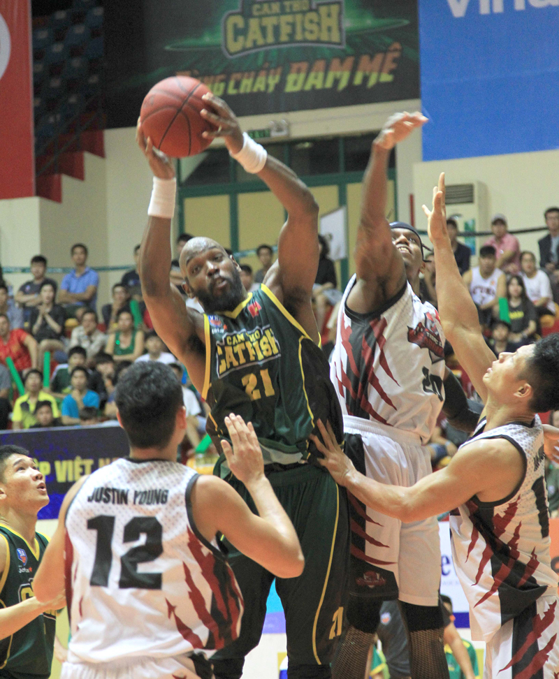 Pha ném rổ của Hamilton (số 21) đội Cantho Catfish trong trận gặp Thăng Long Warriors.