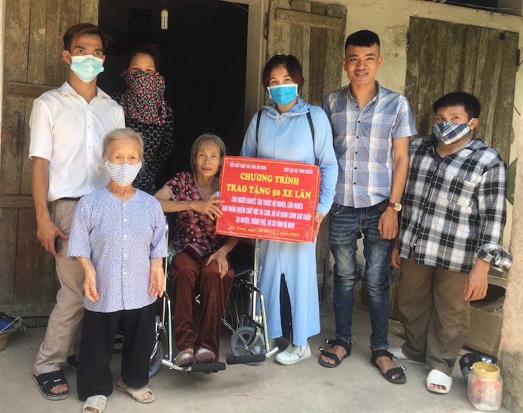 | Kiều Thị Ngọc (áo xanh) trao xe lăn cho gia đình người khuyết tật có hoàn cảnh khó khăn |