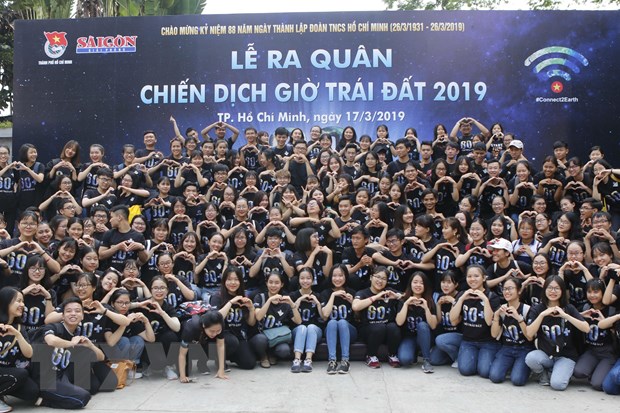 Các tình nguyện viên ở Thành phố Hồ Chí Minh cổ động chiến dịch Giờ Trái đất 2019. (Ảnh:Hoàng Hải/TTXVN)