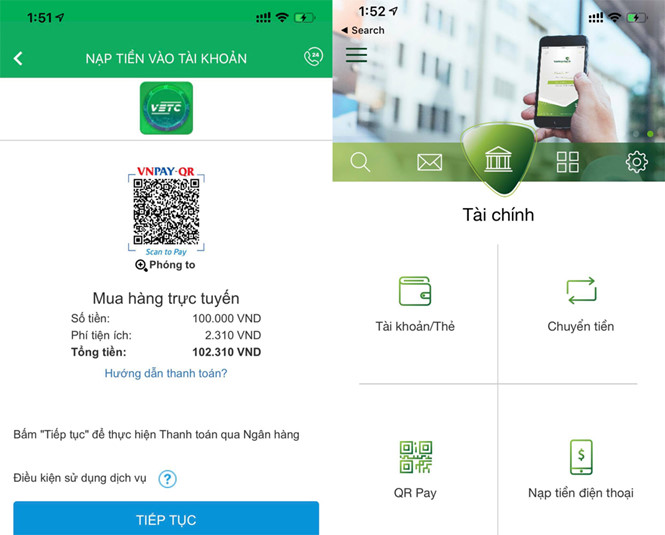Thao tác nạp tiền mua dịch vụ thu phí đường bộ bằng mã QR, và người dùng có thể dùng chính ứng dụng của ngân hàng Vietcombank để thanh toán tiền bằng việc quét mã QR. Ảnh chụp màn hình