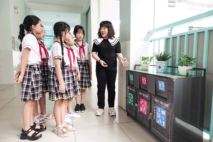 Cô Ngô Thanh Thảo, giáo viên Tổng phụ trách, hướng dẫn học sinh sử dụng thùng rác phân loại.