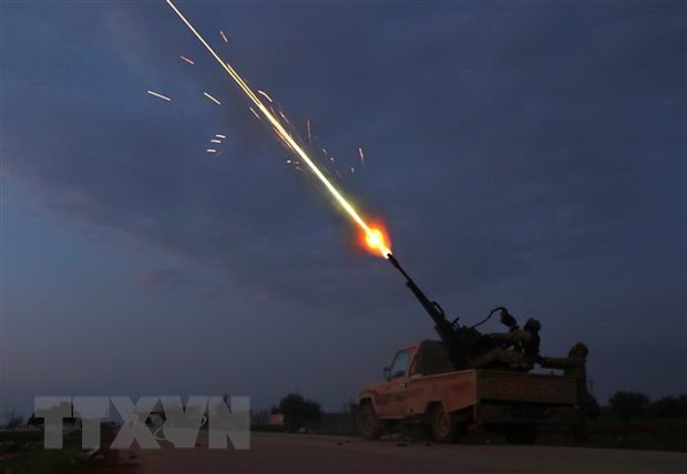 Các tay súng nổi dậy Syria do Thổ Nhĩ Kỳ hậu thuẫn nã súng phòng không nhằm vào các lực lượng Chính phủ Syria tại thị trấn Sarmin, thuộc tỉnh Idlib ngày 24/02/2020. (Ảnh: AFP/TTXVN)