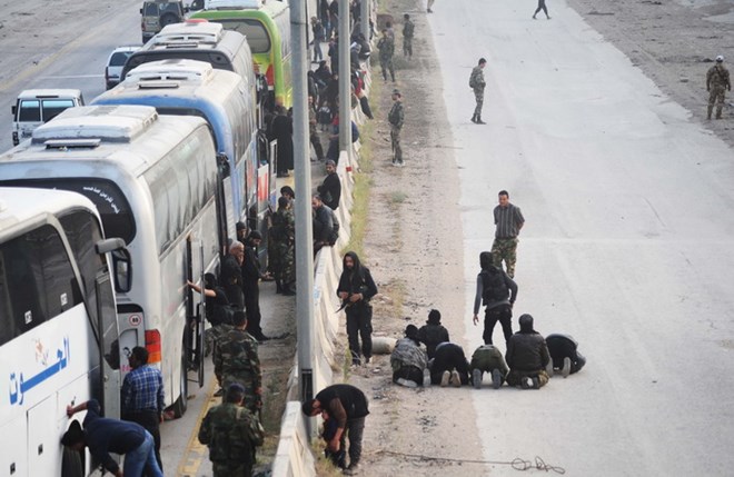 Xe buýt chở các tay súng nổi dậy cùng gia đình rời khỏi thành phố Harasta, ngoại ô Đông Ghouta ngày 22/3. (Ảnh: THX/TTXVN)