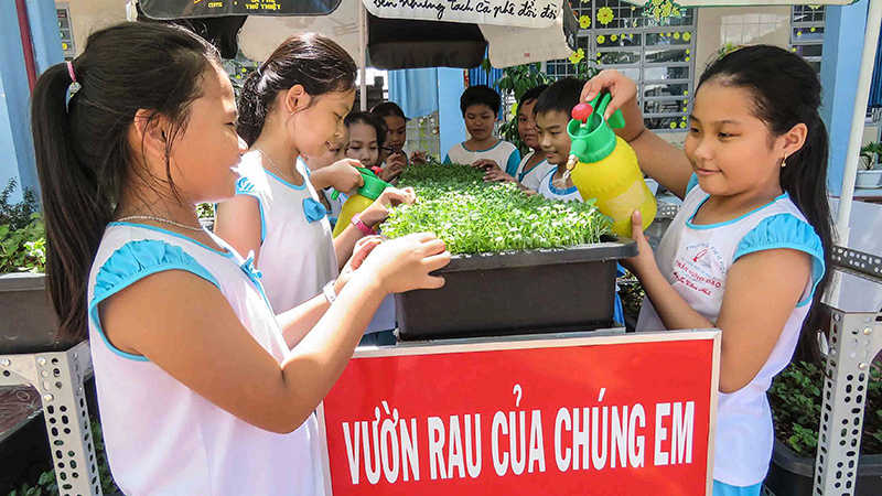 Dù trời khá oi bức nhưng nhiều học sinh Trường Tiểu học Trần Hưng Đạo vẫn hăng hái chăm sóc “Vườn rau của chúng em”. Nguyễn Tâm Như, lớp 5P, hào hứng: “Em học cách trồng, chăm sóc, thu hoạch rau. Rau do mình tự trồng nên em thấy thiệt ngon”. Nguyễn Trần Ánh Kim (cùng lớp với Như), nói thêm: “Chúng em còn trồng, chăm sóc rau mầm, muốn trồng tốt thì phải có đủ nước, ánh sáng, đất… Từ đó em nhớ bài lâu hơn và biết người trồng rau đã cực khổ như thế nào”.