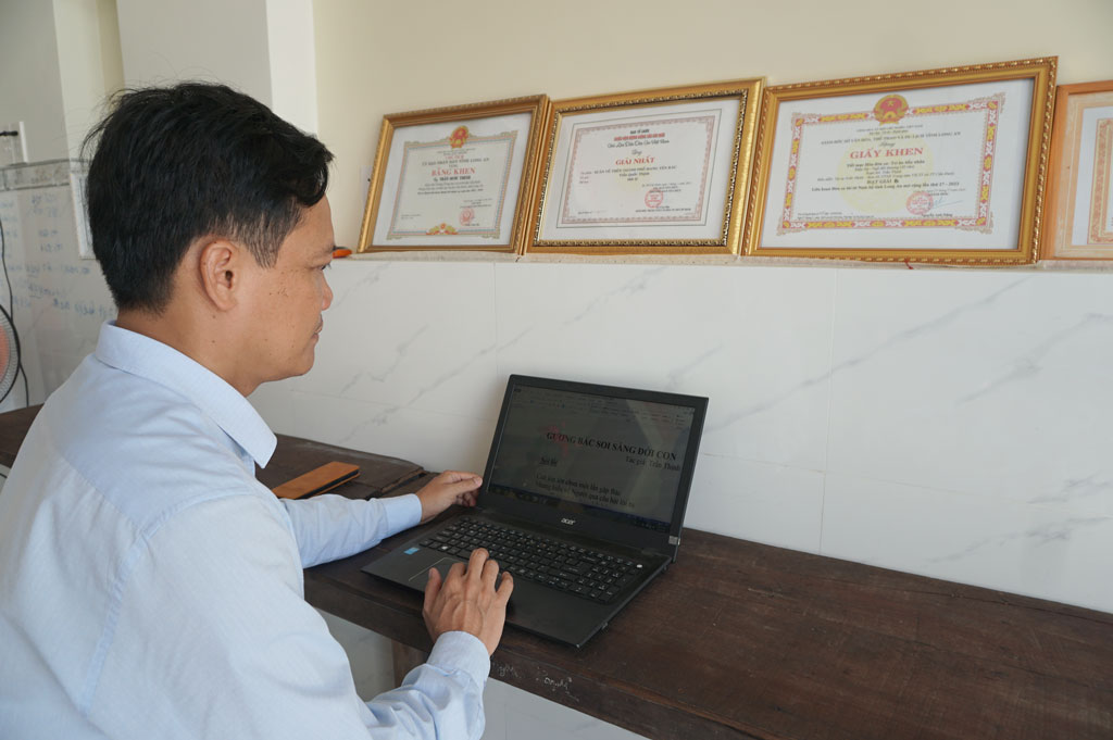 Anh Trần Quốc Thịnh bên bài vọng cổ Gương Bác soi sáng đời con, tác phẩm đoạt giải A thể loại ca cổ của cuộc vận động Sáng tác, quảng bá tác phẩm văn học, nghệ thuật về chủ đề “Học tập và làm theo tư tưởng, đạo đức, phong cách Hồ Chí Minh” tỉnh Long An đợt IX, năm 2022