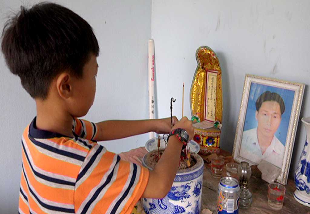 Trong căn nhà nhỏ ở ấp 1B, xã An Thạnh, em Huỳnh Tấn Hải cặm cụi với công việc hàng ngày. Thắp cho cha nén hương, Hải kể: “Mẹ em bỏ 3 cha con em từ lúc em còn nhỏ. Năm 2016, cha em mất vì TNGT. Em trai của em mới 4 tuổi phải về sống với ông bà ngoại. Còn em về sống với bà nội. Cuộc sống không dư dả gì, nội phải đi làm lao công để kiếm tiền lo cho gia đình”.