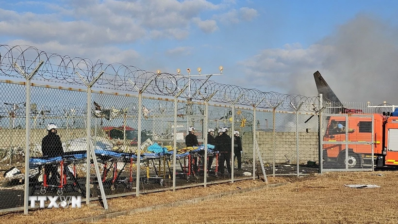| Hiện trường vụ tai nạn máy bay của Jeju Air tại Muan, Hàn Quốc, ngày 29/12/2024. (Ảnh: THX/TTXVN). |