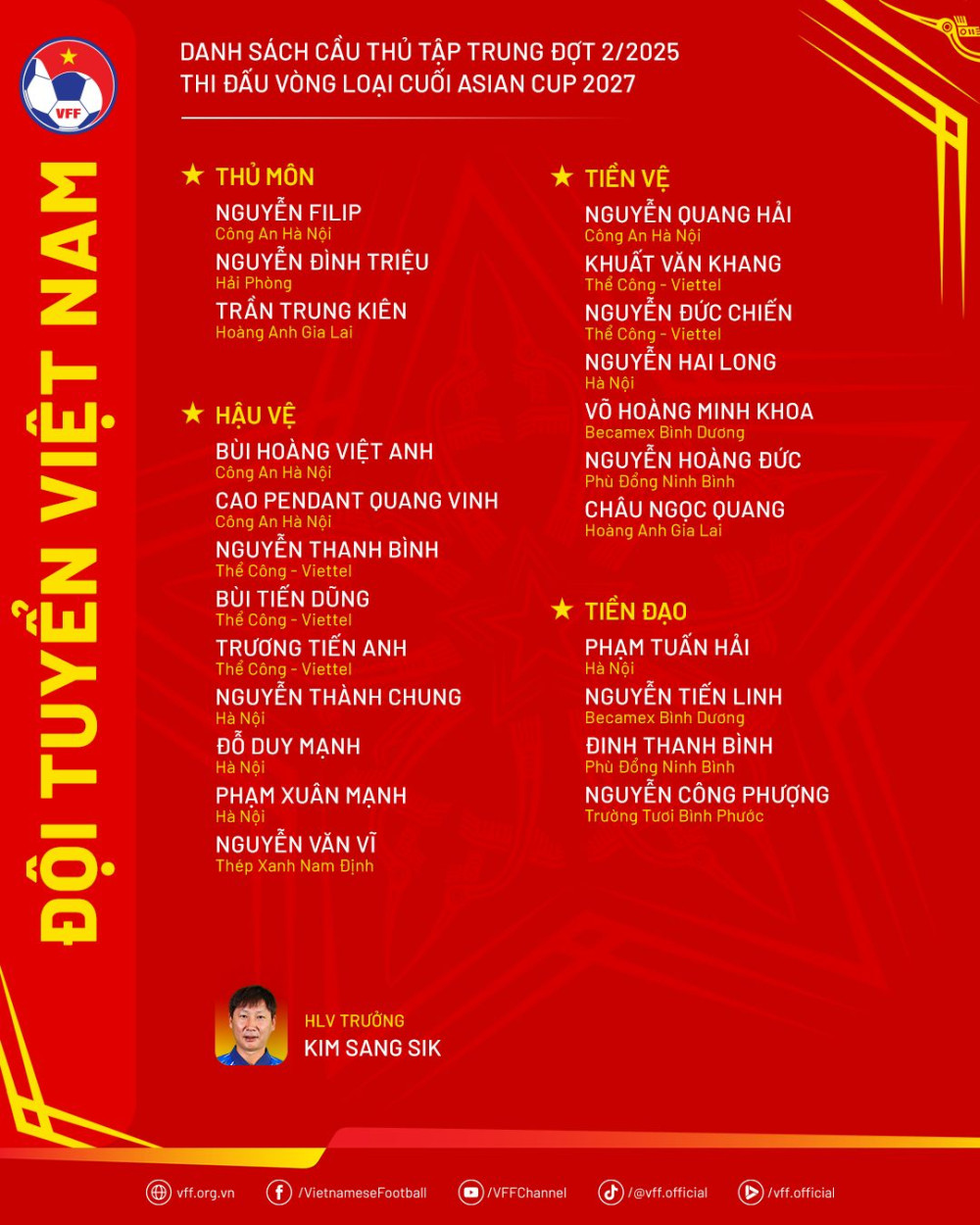Theo như danh sách vừa công bố ở đợt tập trung lần này, HLV Kim Sang Sik chỉ gọi vỏn vẹn 4 tiền đạo là Phạm Tuấn Hải (Hà Nội), Nguyễn Tiến Linh (B.Bình Dương), Đinh Thanh Bình (Phù Đổng Ninh Bình), Nguyễn Công Phượng (Trường Tươi Bình Phước).