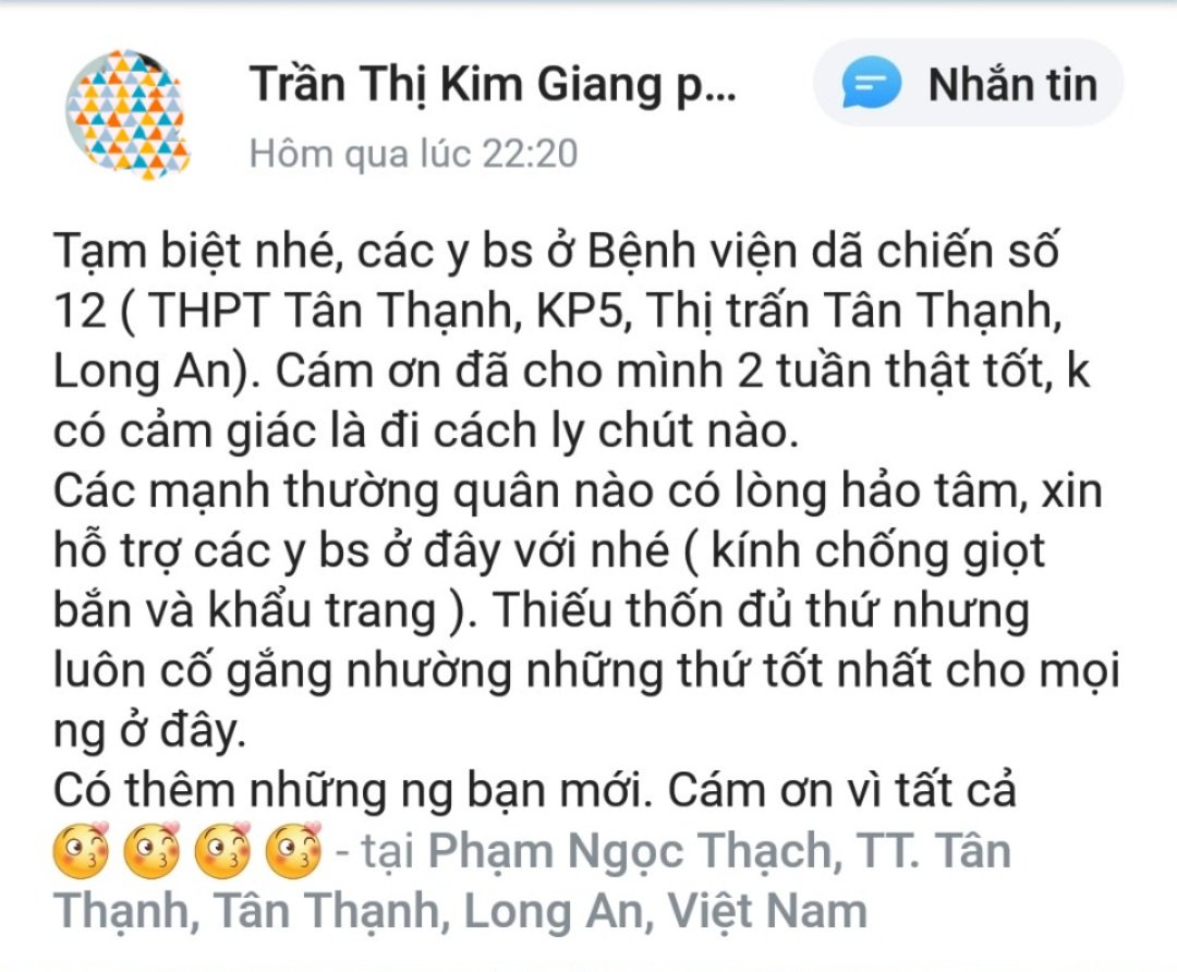 Một bệnh nhân đăng lời cảm ơn các y, bác sĩ ở Bệnh viện dã chiến số 12