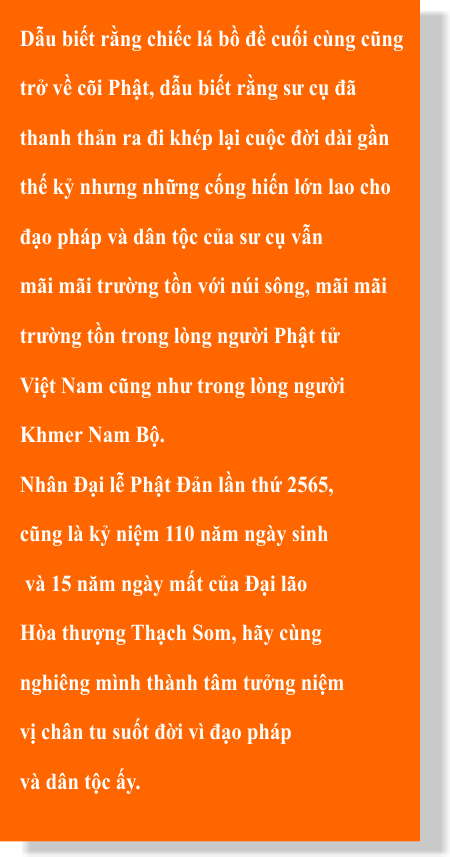 Những ngày đầu xuân 15 năm trước, Đại lão Hòa thượng Phó Pháp chủ Thạch Som nhập niết bàn. Một chiếc lá bồ đề đã trở về cùng cõi Phật nhưng trong lòng người phật tử Việt Nam, người Khmer Nam Bộ vẫn còn mãi hình ảnh một vị chân tu hết lòng vì đạo pháp, vì dân tộc với tài năng và đức độ phi thường.