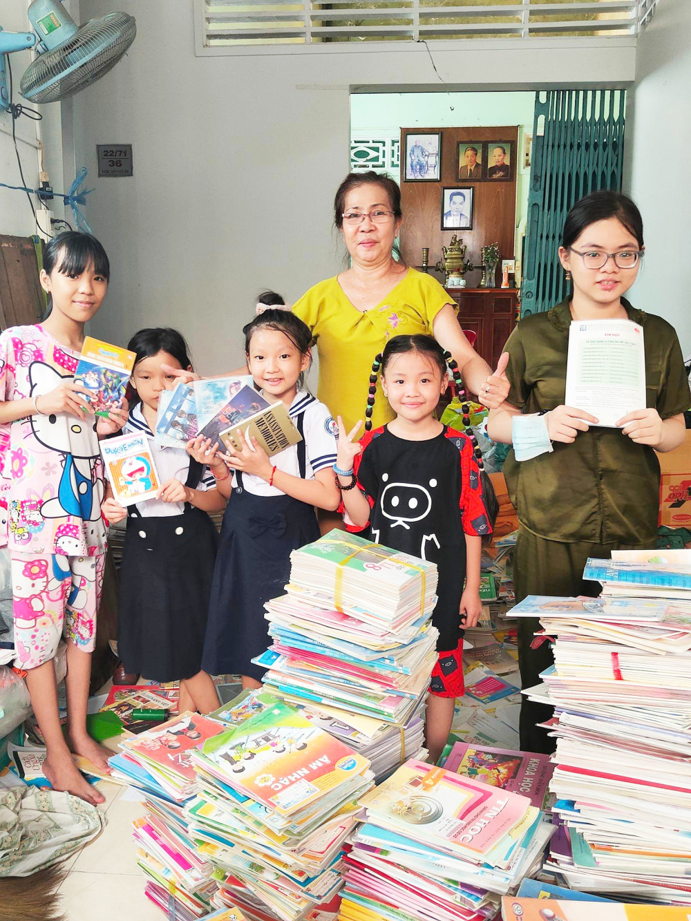 Cô Mỹ Uyên và các em học sinh bên sách giáo khoa được soạn, phân loại để tặng học sinh có hoàn cảnh khó khăn. Ảnh: CLB cung cấp