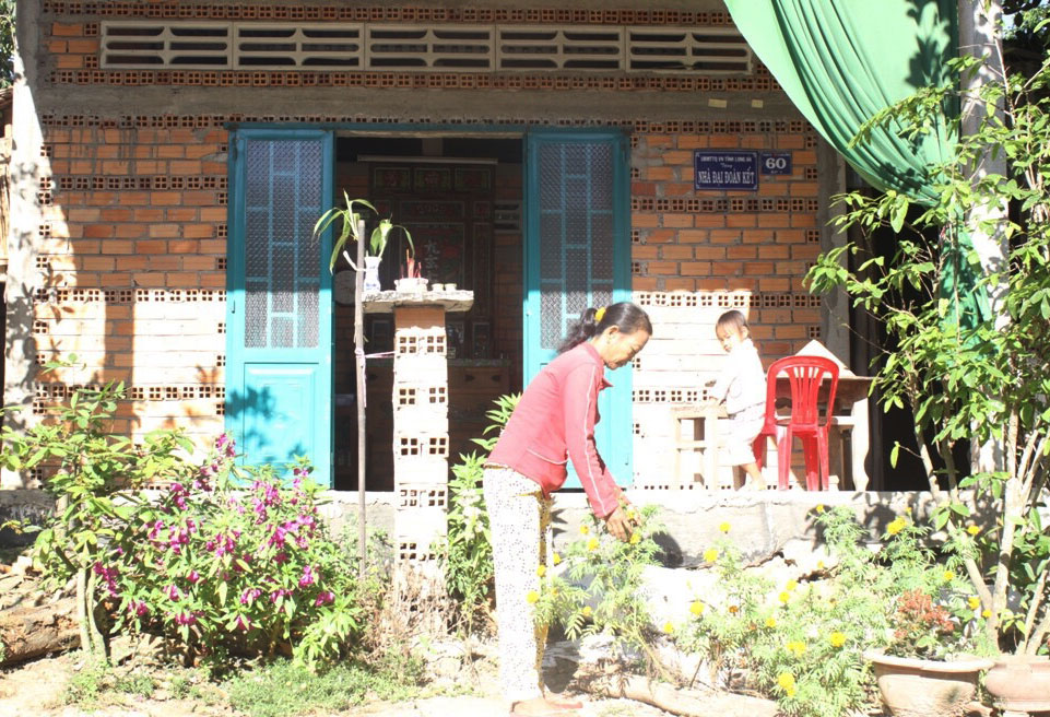 Bên cạnh đó, CBCS còn vận động xây nhà đại đoàn kết cho bà Lâm Thị La, ngụ ấp 1, xã Thạnh Trị, thị xã Kiến Tường. Bà La có hoàn cảnh gia đình khó khăn, bà tuổi cao, sức yếu, không đất sản xuất lại phải nuôi mẹ già ngoài 90 tuổi. Bà La chia sẻ: “Từ khi có nhà mới, gia đình tôi vui lắm! Trước đây, trời nắng thì còn đỡ chứ trời mưa là cả nhà gom hết thau chậu để hứng nước. Tôi biết ơn các chú BĐBP lắm, nhờ các chú mà gia đình tôi có chỗ ở ổn định”.