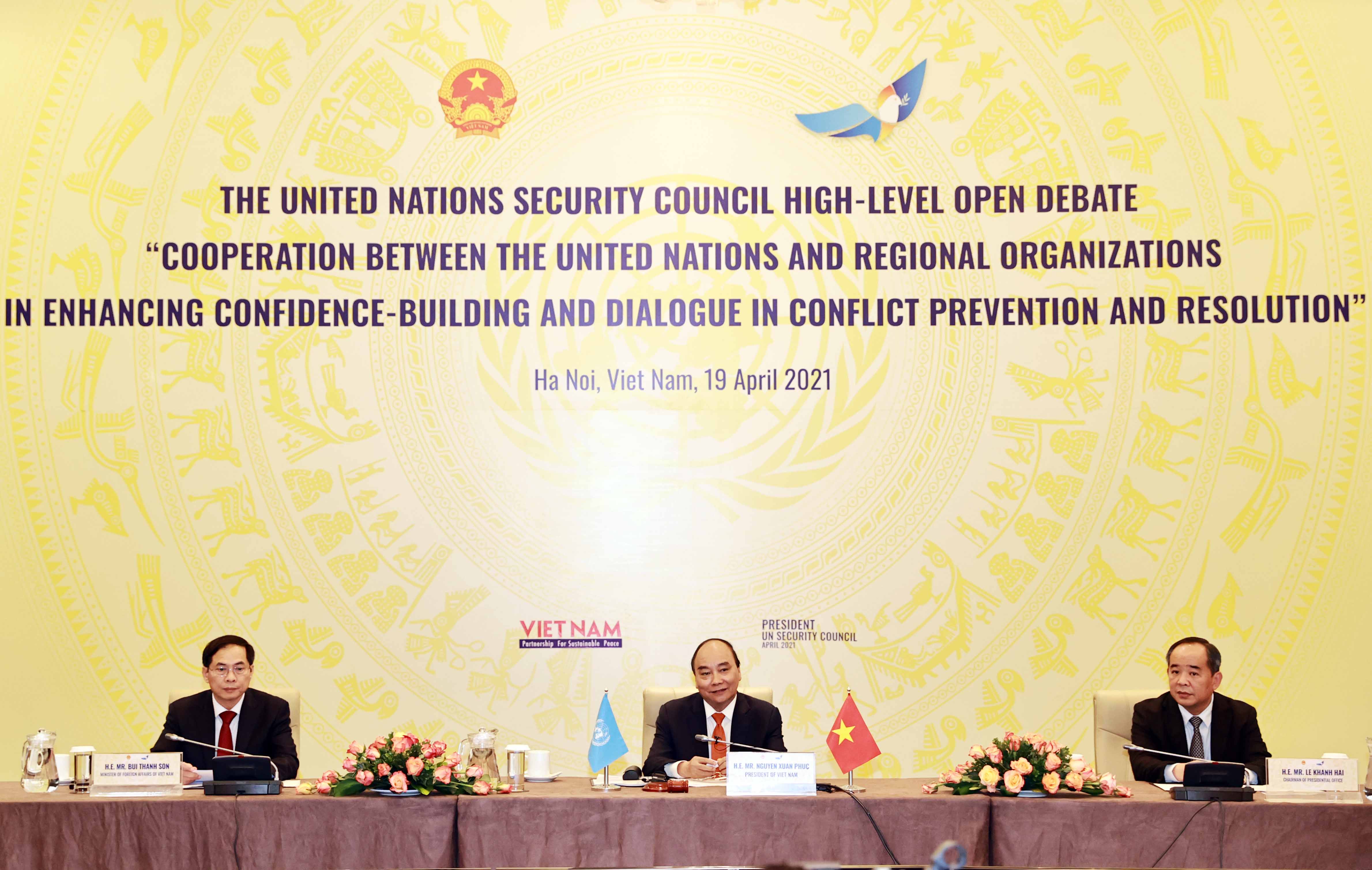 Ngày 19/4/2021, trên cương vị Chủ tịch Hội đồng Bảo an Liên hợp quốc (HĐBA LHQ) tháng 4/2021, Chủ tịch nước Nguyễn Xuân Phúc đã chủ trì Phiên thảo luận mở Cấp cao của HĐBA về chủ đề “Tăng cường hợp tác giữa Liên hợp quốc với các tổ chức khu vực nhằm thúc đẩy xây dựng lòng tin và đối thoại trong ngăn ngừa và giải quyết xung đột” dưới hình thức kết hợp giữa trực tuyến và trực tiếp tại Hà Nội.