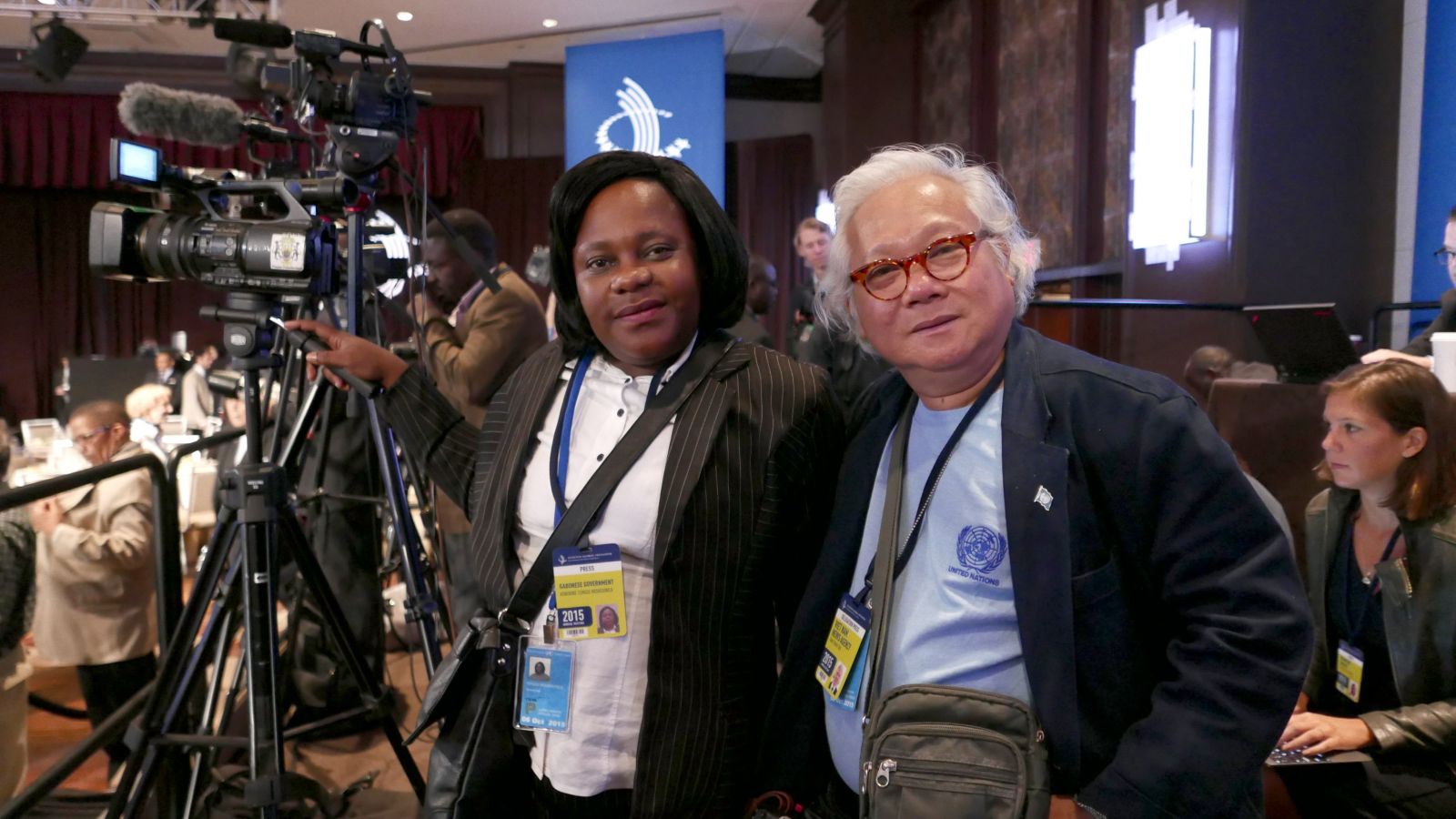 Nhà báo, nhiếp ảnh gia Giản Thanh Sơn (bìa phải) với đồng nghiệp đang tác nghiệp tại Trụ sở Liên Hợp Quốc, năm 2015 (Ảnh do ký giả John F. chụp)