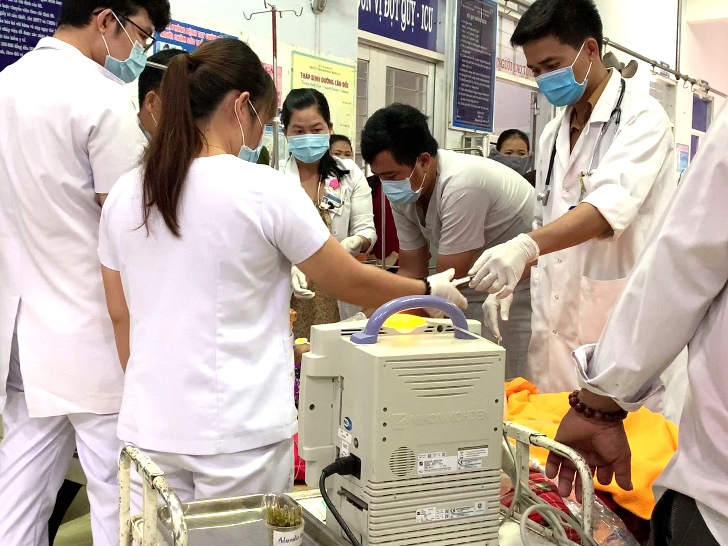 Khoa Hồi sức Cấp cứu là nơi tập trung khá đông người vì mỗi ngày tiếp nhận nhiều ca cấp cứu. Các y, bác sĩ, điều dưỡng luôn đặt công tác phòng, chống dịch Covid-19 lên hàng đầu. Gặp bác sĩ trẻ Nguyễn Văn Út sau khi anh cùng các bác sĩ và điều dưỡng khác vừa hoàn thành việc cấp cứu 1 ca bệnh. Anh thay găng tay, khẩu trang và thực hiện vệ sinh cá nhân trước khi tiếp chuyện với chúng tôi. “Là bác sĩ ở Khoa Hồi sức Cấp cứu, thường xuyên tiếp xúc với người bệnh nên nguy cơ lây nhiễm bệnh rất cao, vì thế, tôi luôn tuân thủ các quy định trong phòng, chống dịch và nhắc nhở bệnh nhân, thân nhân người bệnh cùng thực hiện” - bác sĩ Nguyễn Văn Út chia sẻ.