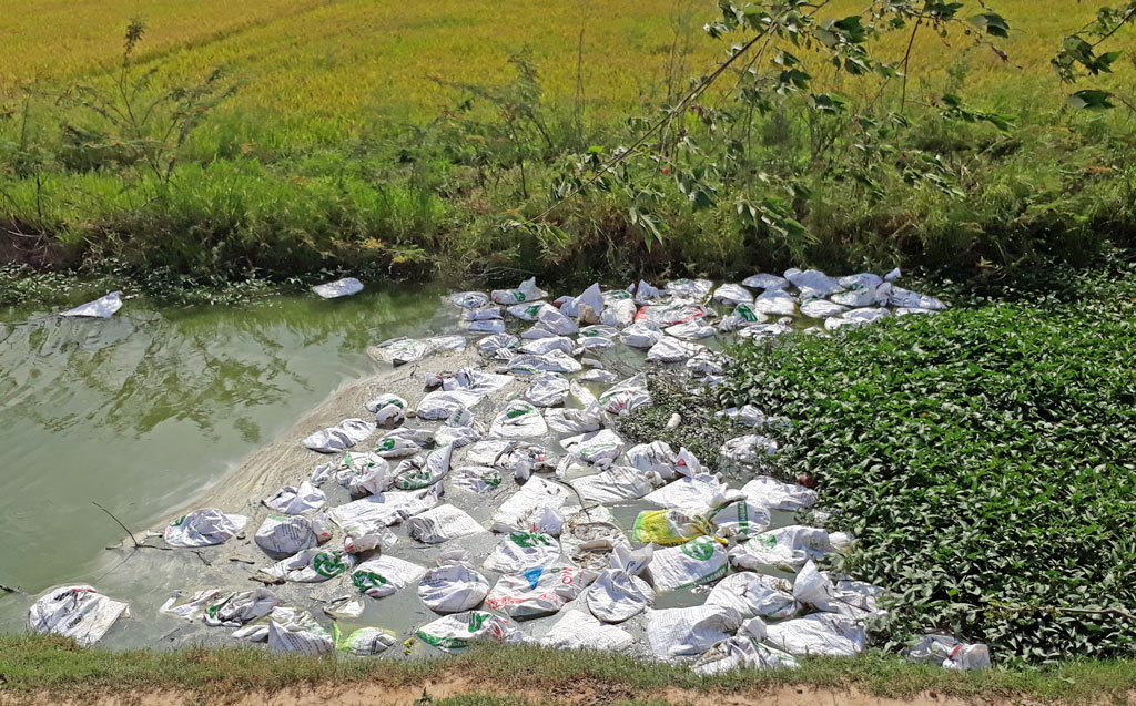 Theo phản ánh, khoảng 1 tuần qua, người dân sống tại ấp Gò Chuối, xã Hưng Điền bị “tra tấn” bởi mùi hôi thối bốc ra từ các bao cá chết bị đổ xuống cặp tuyến lộ kênh ranh. Theo anh Vũ, người dân địa phương cho biết, nhiều ngày nay, cá chết do nhiễm bệnh, người dân không xử lý, chôn cất mà tự ý đổ xuống khu vực này.