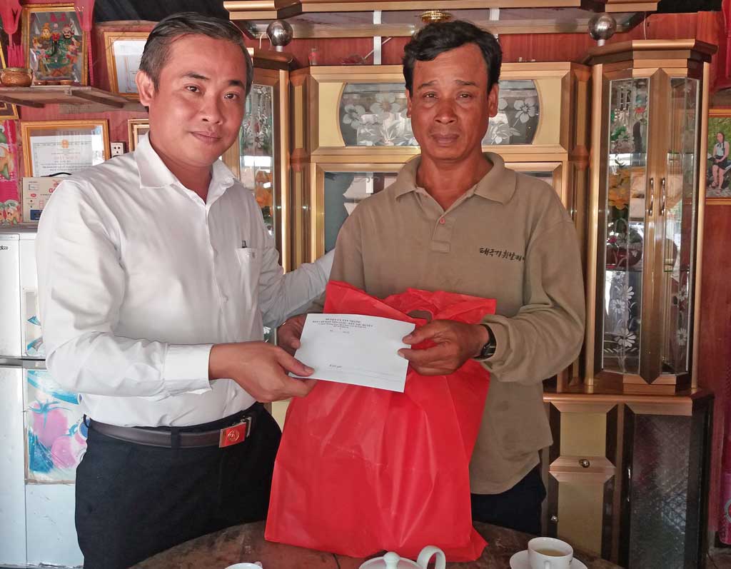 Ông Lê Thanh Đông (trái) - Trưởng ban Dân vận Huyện ủy Tân Thạnh - Trưởng đoàn đến thăm, tặng quà cho các gia đình là người dân tộc Khmer.