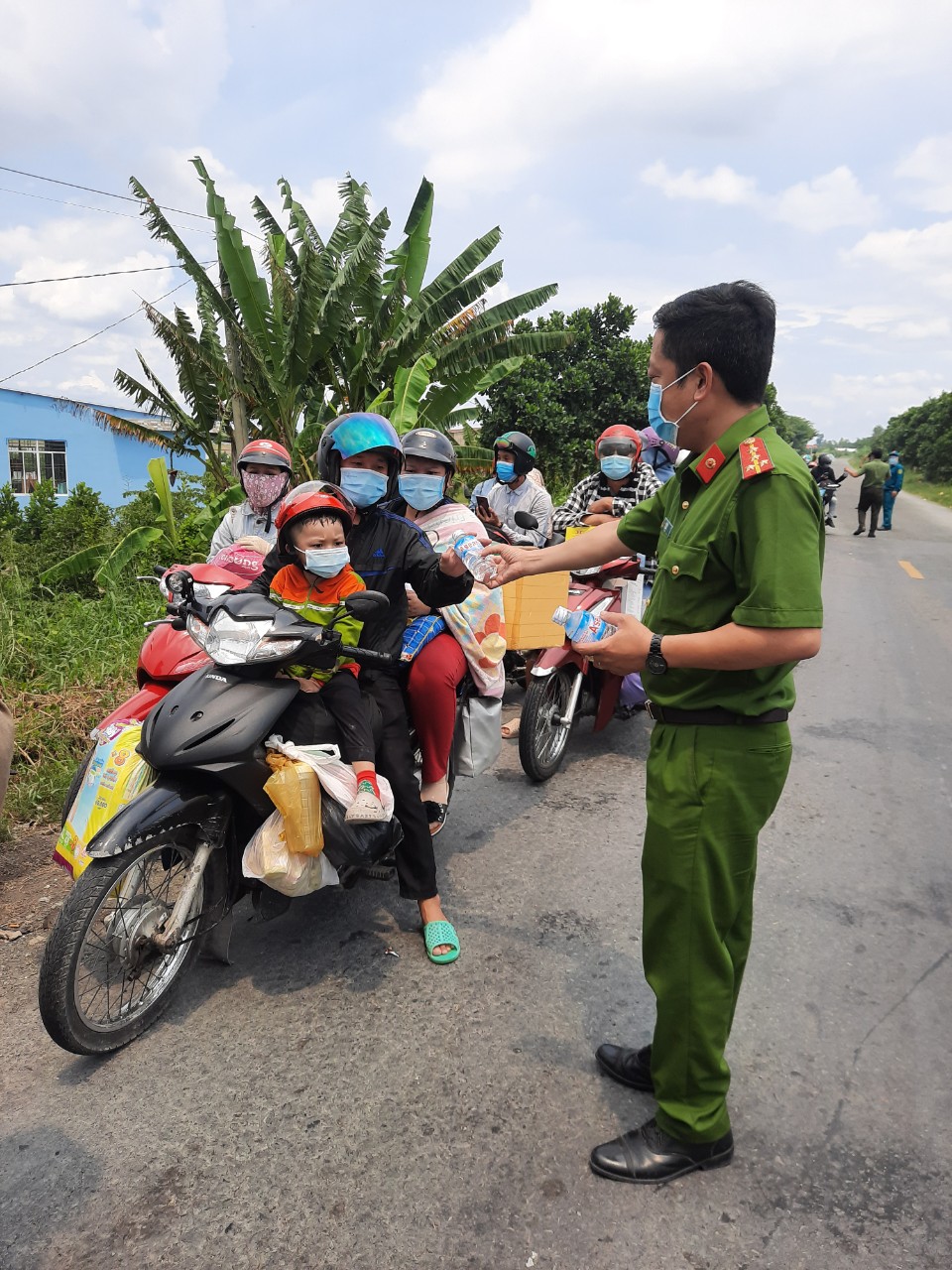 Công an huyện Tân Thạnh phát nước cho người dân miền Tây trước khi lên xe đưa họ về quê