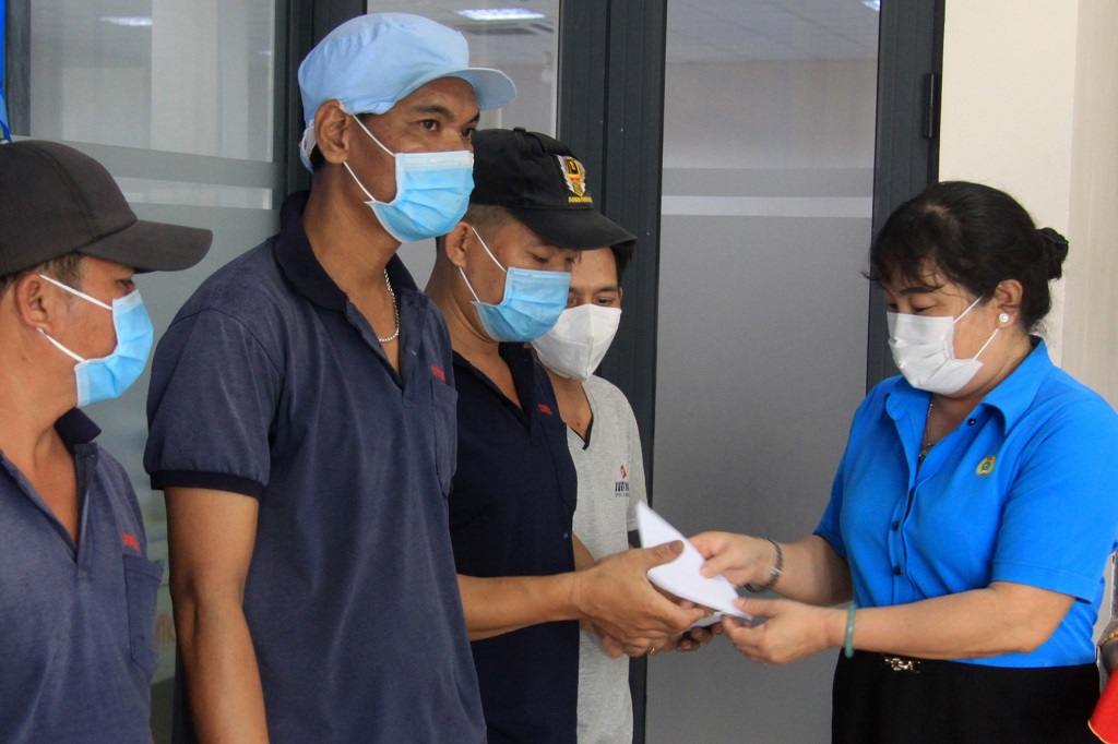 Phó Chủ tịch Liên đoàn Lao động tỉnh - Lê Thị Thu Cúc trao quà cho công nhân, lao động