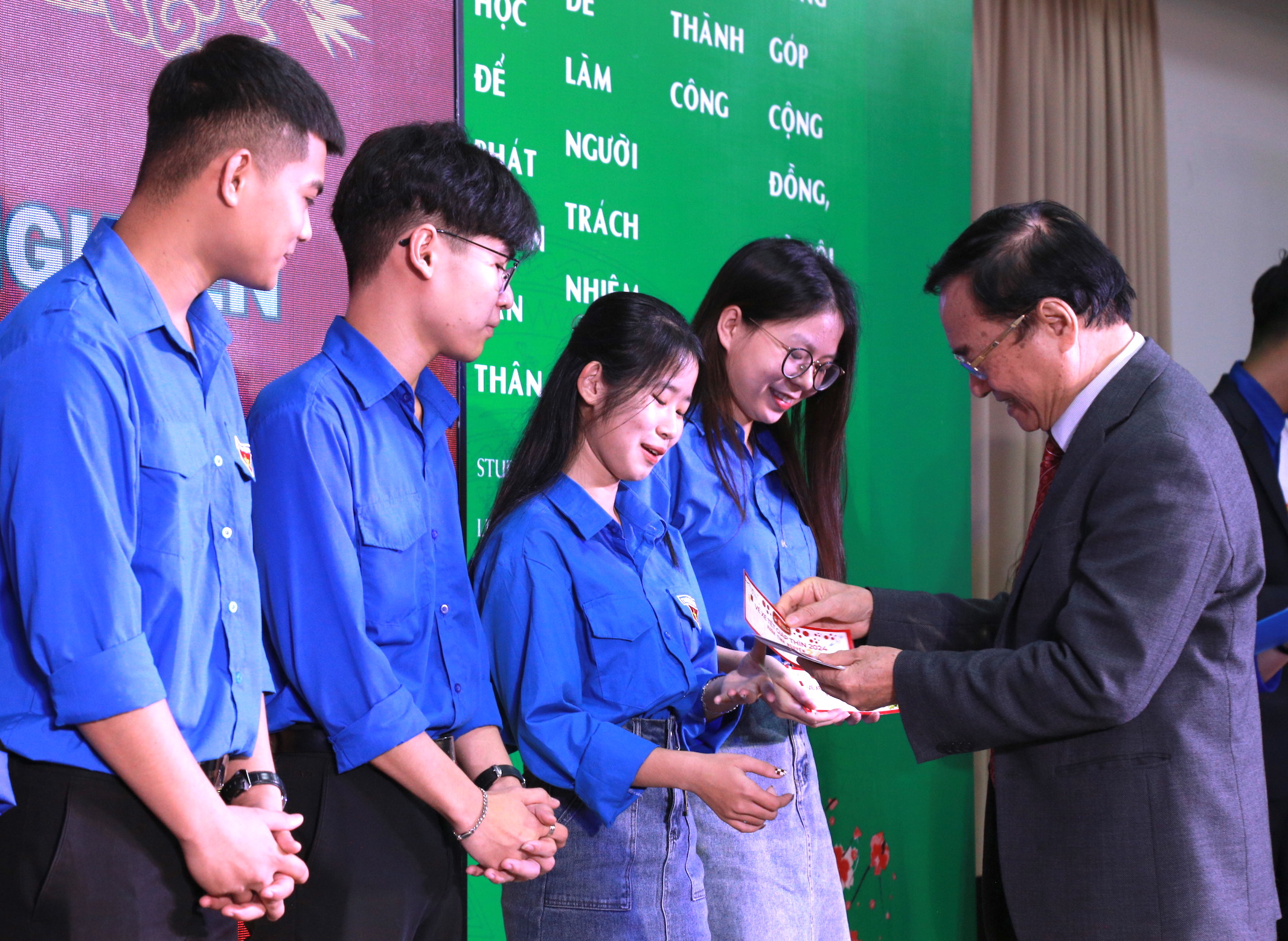 | Đại diện Ban Giám hiệu Nhà trường trao tặng vé xe cho sinh viên khó khăn về quê đón Tết. |