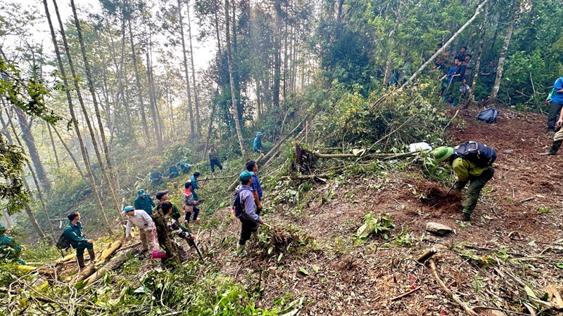 | Lực lượng chức năng và người dân tập trung cắt đường băng cản lửa cứu rừng trên đỉnh Tây Côn Lĩnh, tỉnh Hà Giang |