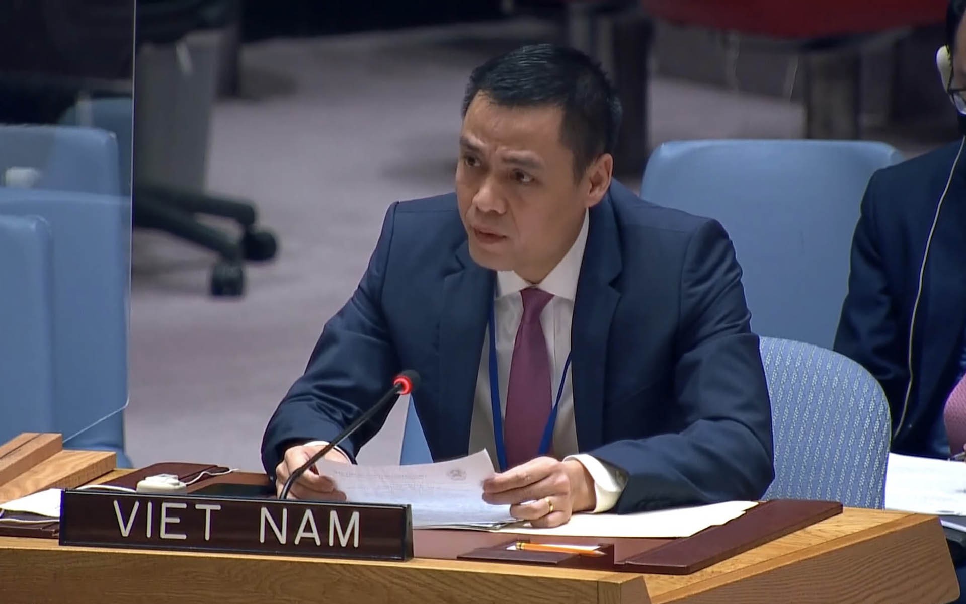 | Đại sứ Đặng Hoàng Giang, Trưởng Phái đoàn thường trực Việt Nam tại LHQ phát biểu tại phiên họp. (Ảnh: Phái đoàn Việt Nam tại LHQ) |