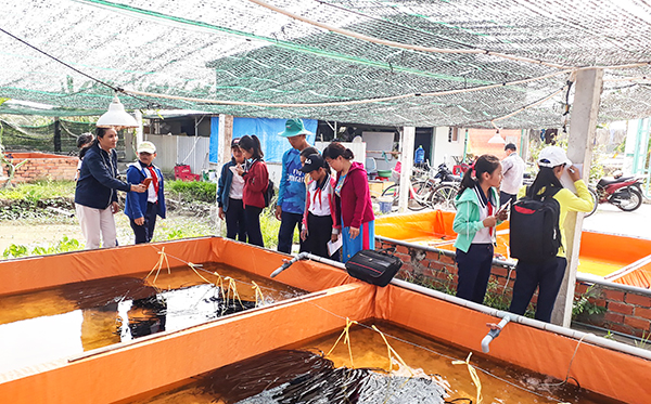 Học sinh Trường THCS Thới An Đông tham quan thực tế trại nuôi lươn. Ảnh: B.KIÊN