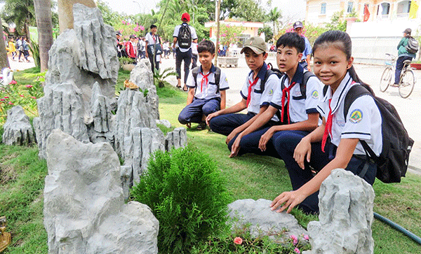 Học sinh Trường THCS Thị trấn Thới Lai tìm hiểu văn hóa, lịch sử tại mô hình “Vườn Địa lý”.