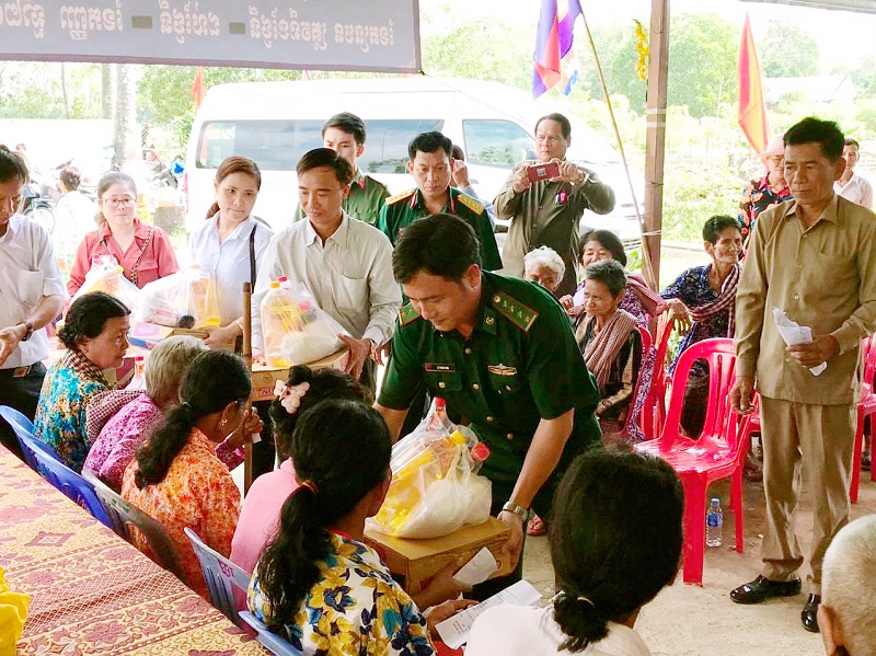 | Lãnh đạo đồn biên phòng Thạnh Trị tặng quà cho người dân nghèo vùng biên giới của nước bạn |