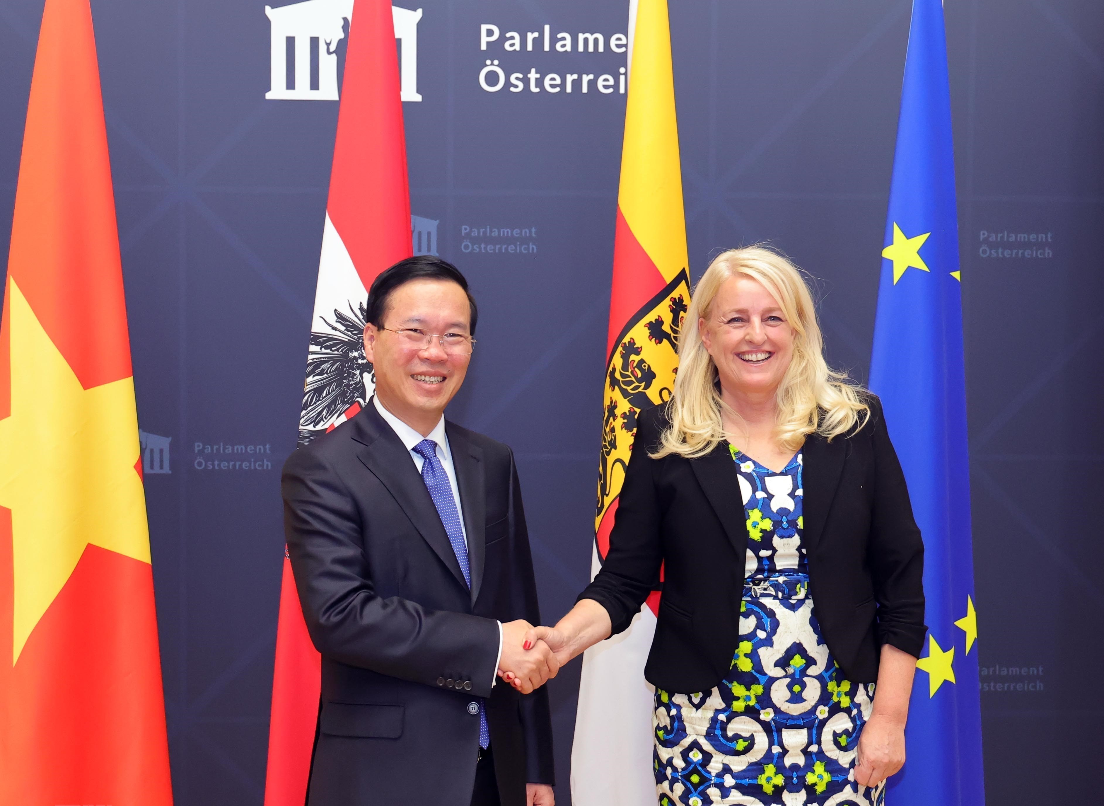Ngày 24/7/2023, tại thủ đô Viên, trong khuôn khổ chuyến thăm chính thức Cộng hòa Áo, Chủ tịch nước Võ Văn Thưởng đã gặp Chủ tịch Thượng viện Áo Claudia Arpa (Cờ -lau-đi-a Ác-pa).