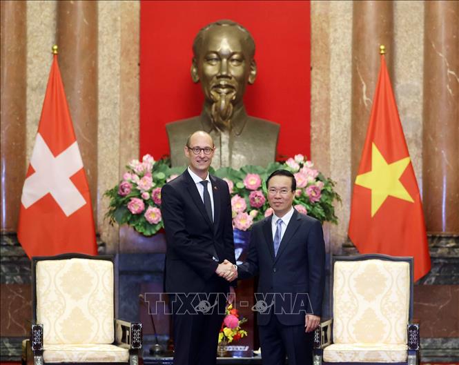 | Chủ tịch nước Võ Văn Thưởng tiếp Chủ tịch Hội đồng Quốc gia Thụy Sĩ Martin Candinas. Ảnh: Thống Nhất – TTXVN. |