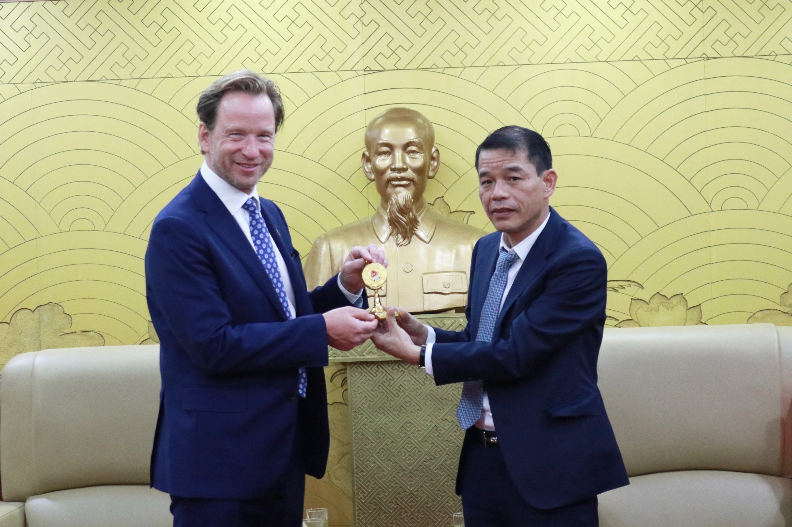 | Đồng chí Vũ Thanh Mai tặng ông Greg Wilcock quà lưu niệm của Ban Tuyên giáo Trung ương |