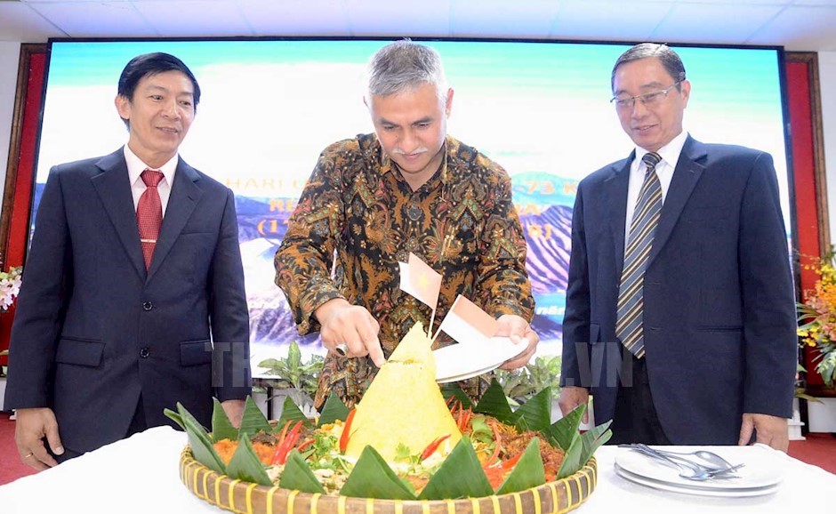 Tổng Lãnh sự Indonesia tại TP Hồ Chí Minh Hanif Salim (giữa) thực hiện nghi thức cắt cơm tháp vàng mừng Ngày độc lập Cộng hòa Indonesia. (Ảnh: Long Hồ)