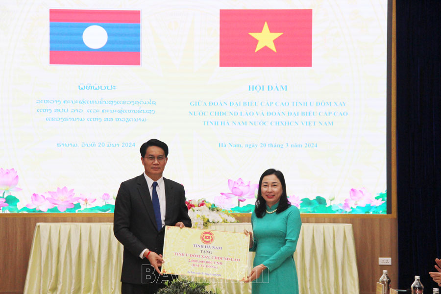 | Phó Bí thư Thường trực Tỉnh ủy Hà Nam Đinh Thị Lụa trao kinh phí tỉnh Hà Nam hỗ trợ tặng tỉnh U Đôm Xay (Ảnh: Báo Hà Nam) |