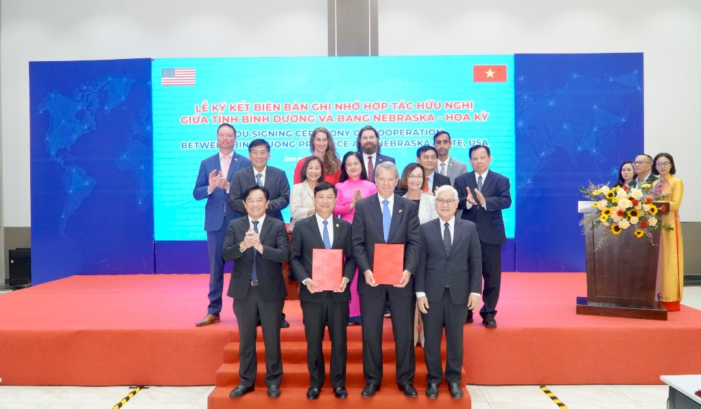 | Nghi thức ký kết bản ghi nhớ giữa UBND tỉnh Bình Dương (Việt Nam) và Chính quyền bang Nebraska (Hoa Kỳ) về việc thiết lập quan hệ hữu nghị và hợp tác. |