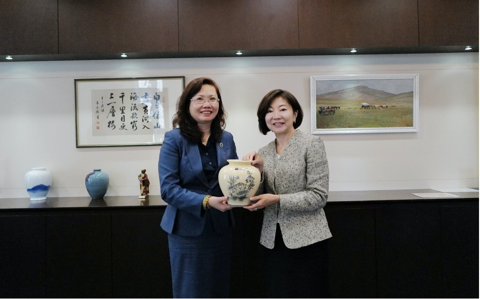 | Chủ tịch UBCKNN Vũ Thị Chân Phương (bên trái) trao quà lưu niệm cho Phó Chủ tịch JICA Miyazaki Katsura. (Ảnh: TL) |