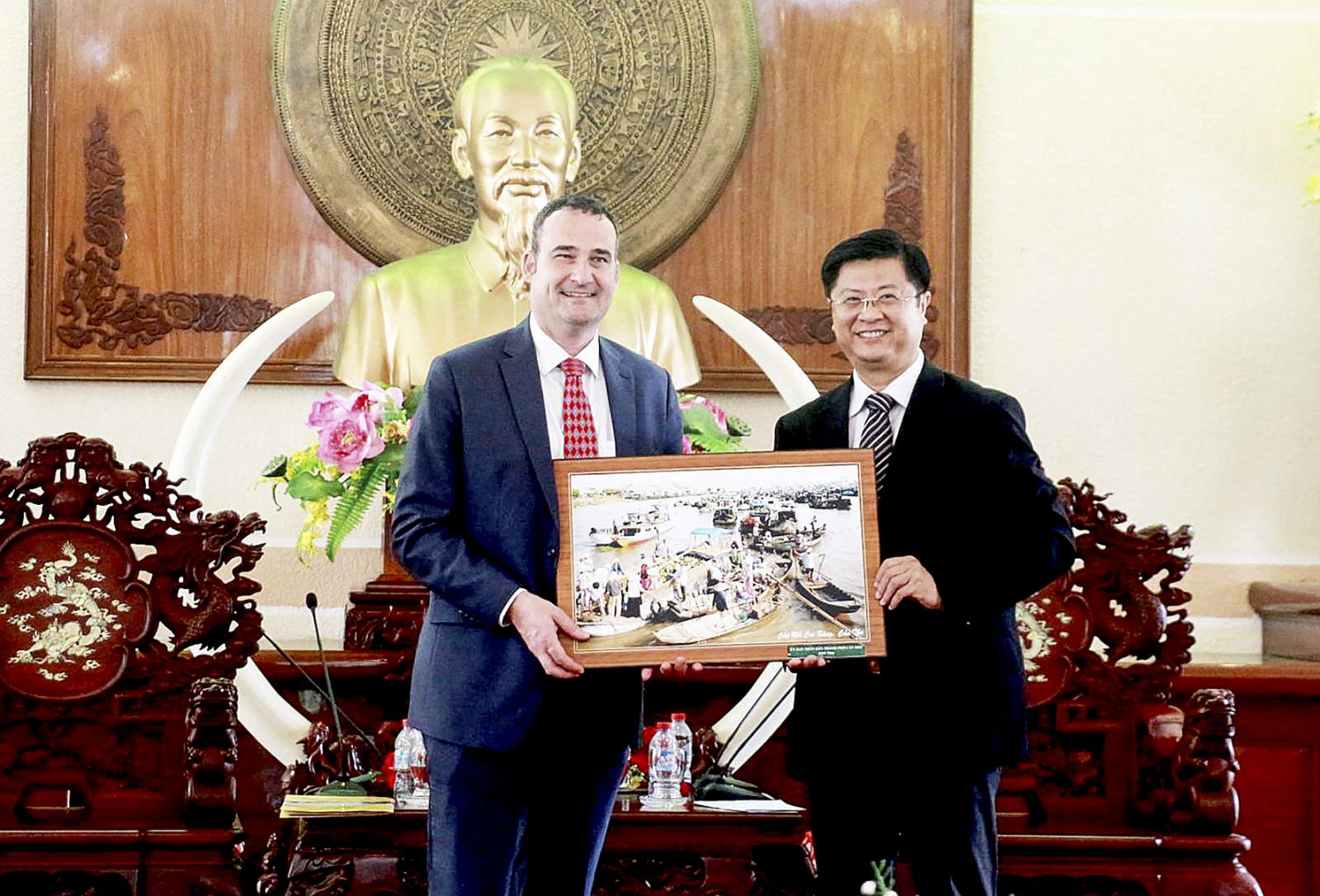 Phó Chủ tịch UBND TP Cần Thơ Trương Quang Hoài Nam tặng quà lưu niệm cho Tổng Lãnh sự Canada. Ảnh: NAM HƯƠNG