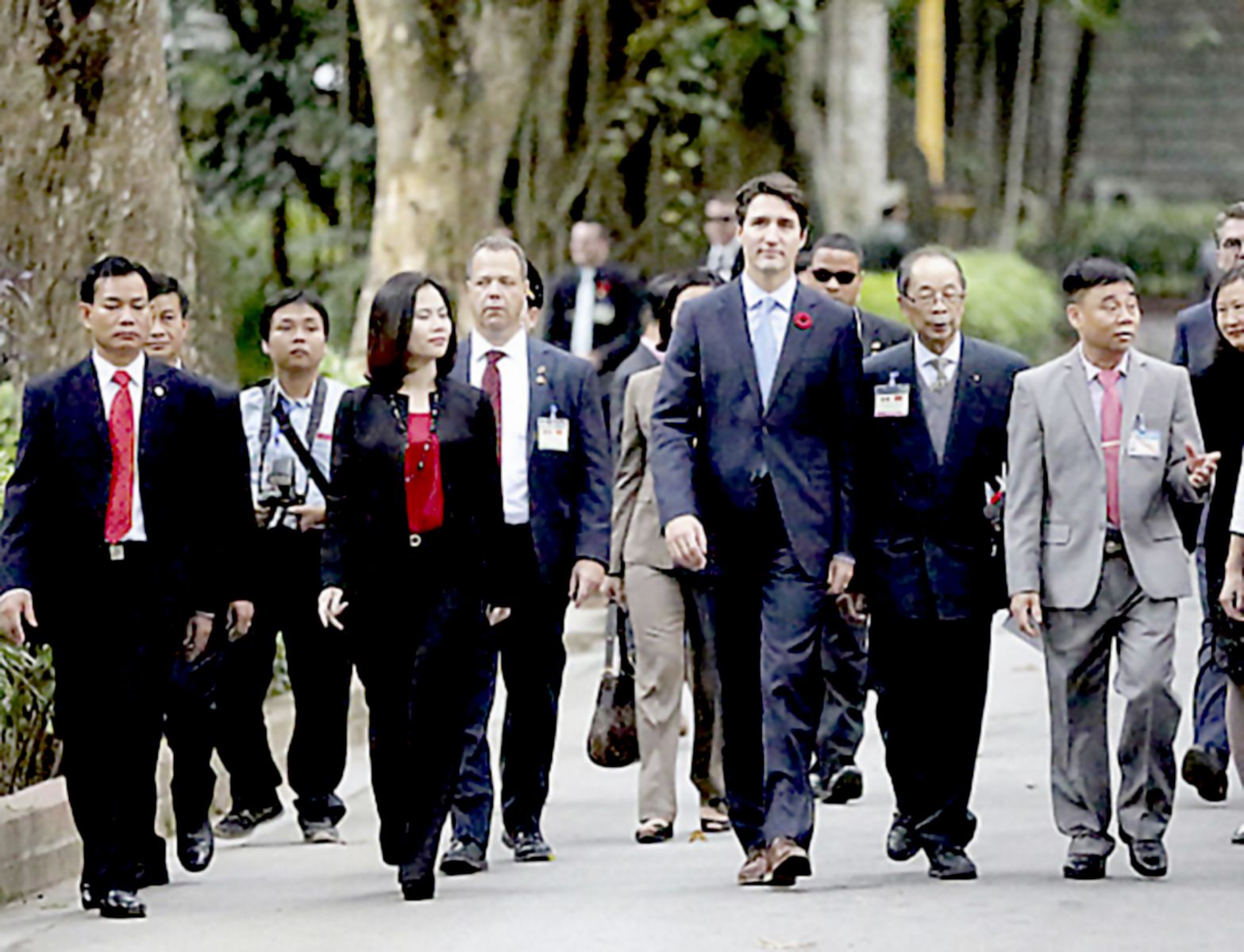 Thủ tướng Canada Justin Trudeau (giữa) trong chuyến thăm Việt Nam tháng 11-2017.